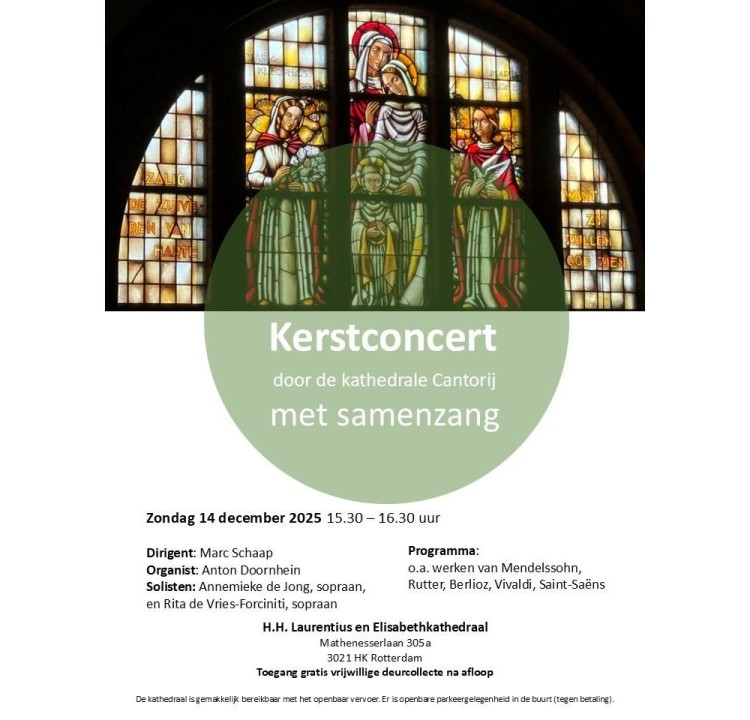 Op zondag 14 december 2025 zingt de Laurentius en Elisabeth Cantorij haar kerstconcert in de kathedraal aan de Mathenesserlaan 305, Rotterdam. Aanvang: 15:30 uur.