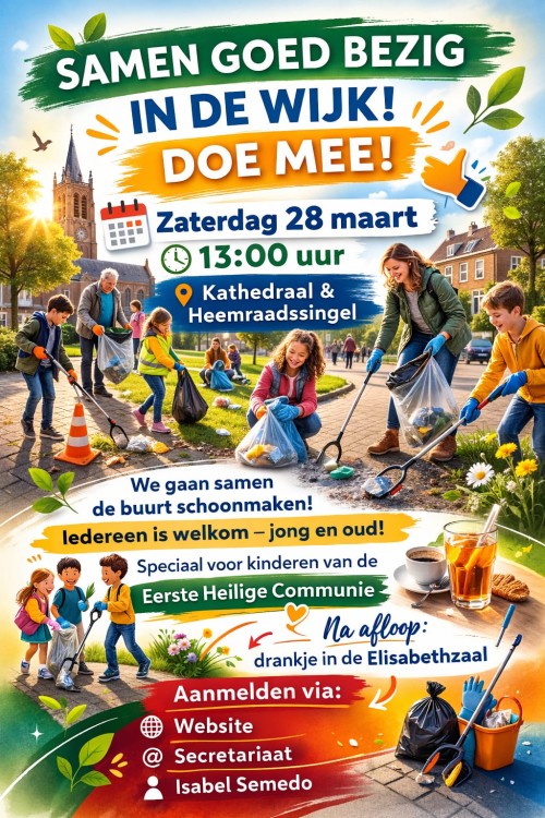 De kinderen van de Eerste Heilige Communie-groep worden speciaal uitgenodigd om er zich bewust van te worden hoe we moeten omgaan met de eigen (leef)omgeving. Maar niet alleen zij zijn uitgenodigd.Iedereen mag erbij zijn, jong en oud.Na de opruimactie komen we samen voor een drankje in de Elisabethzaal.